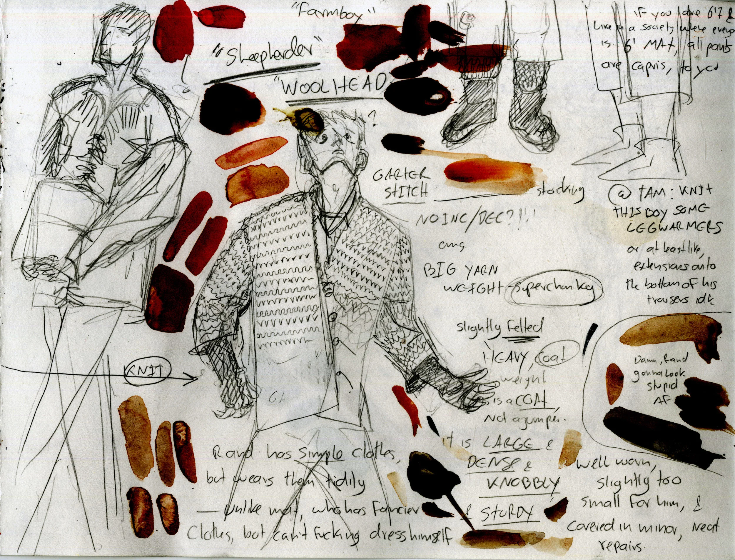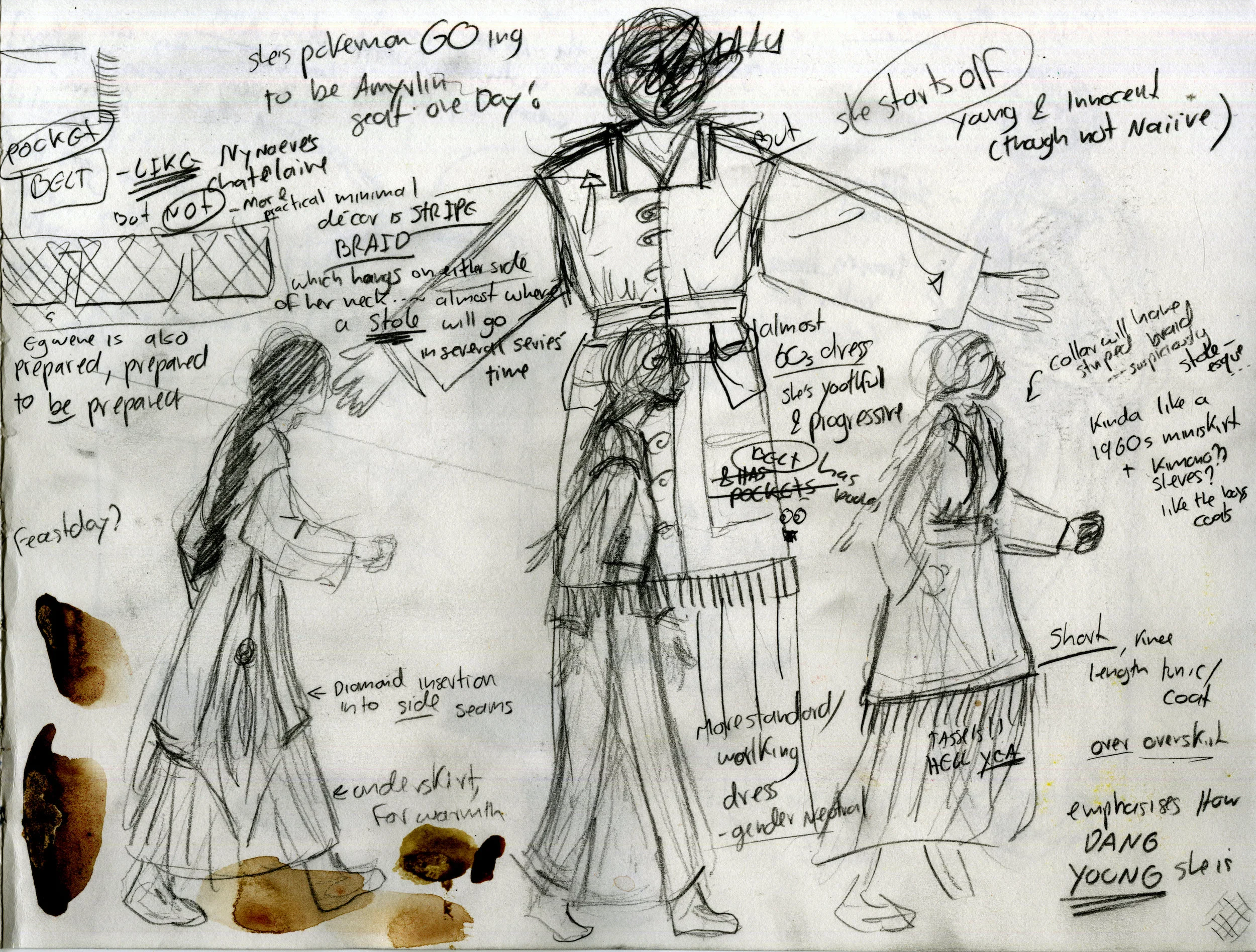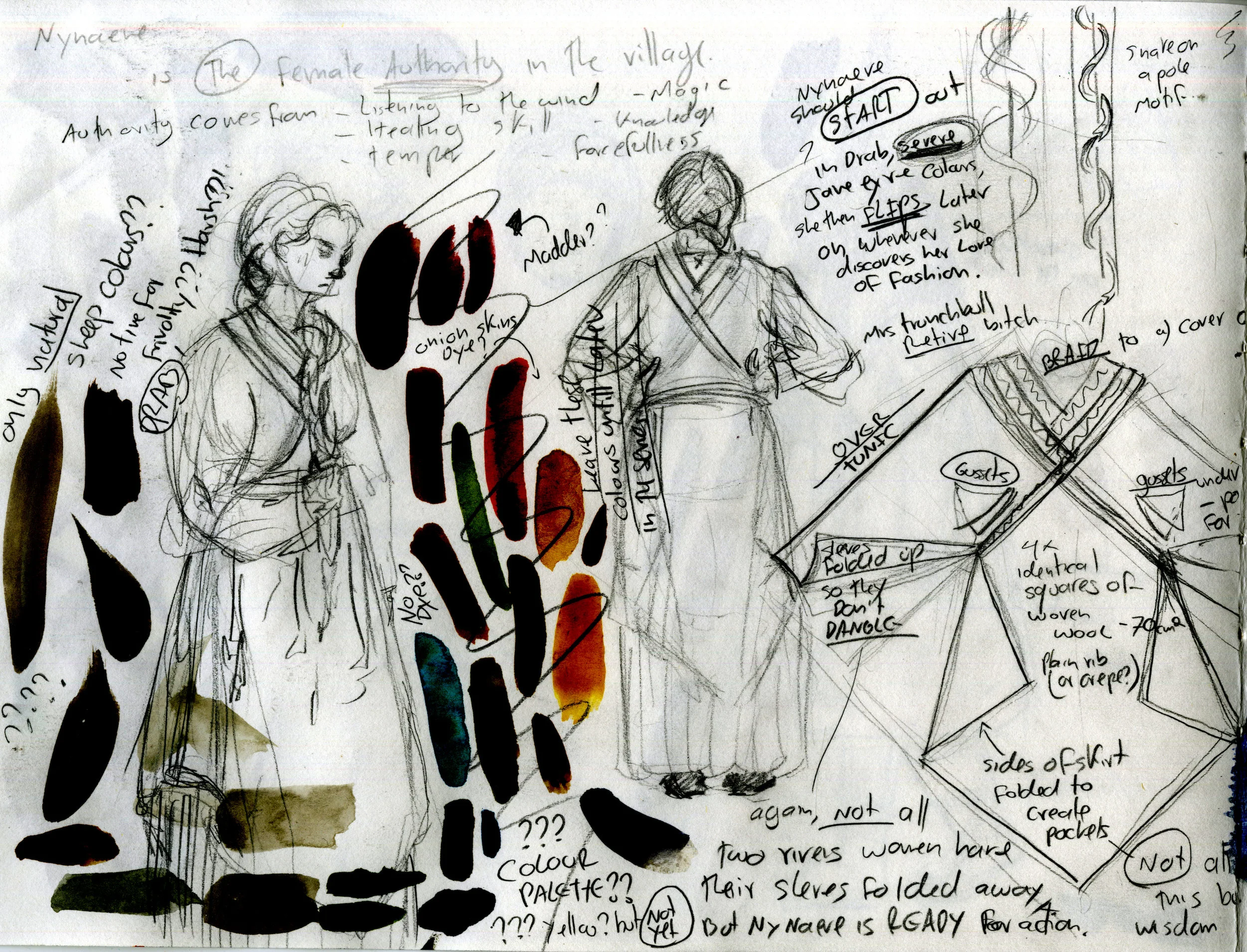 I wanted to express the Wheel’s world through very simple cuts, contrasting with and elaborately woven textiles. I developed a style of pattern cutting which used only square and rectangular shapes of material – intended to be sewn together straight off the loom. I investigated the variety of textures I could create through weaving, developing a variety of samples on an antique Irish 8-shaft loom, and culminating in the weaving of my own material for the final costumes.