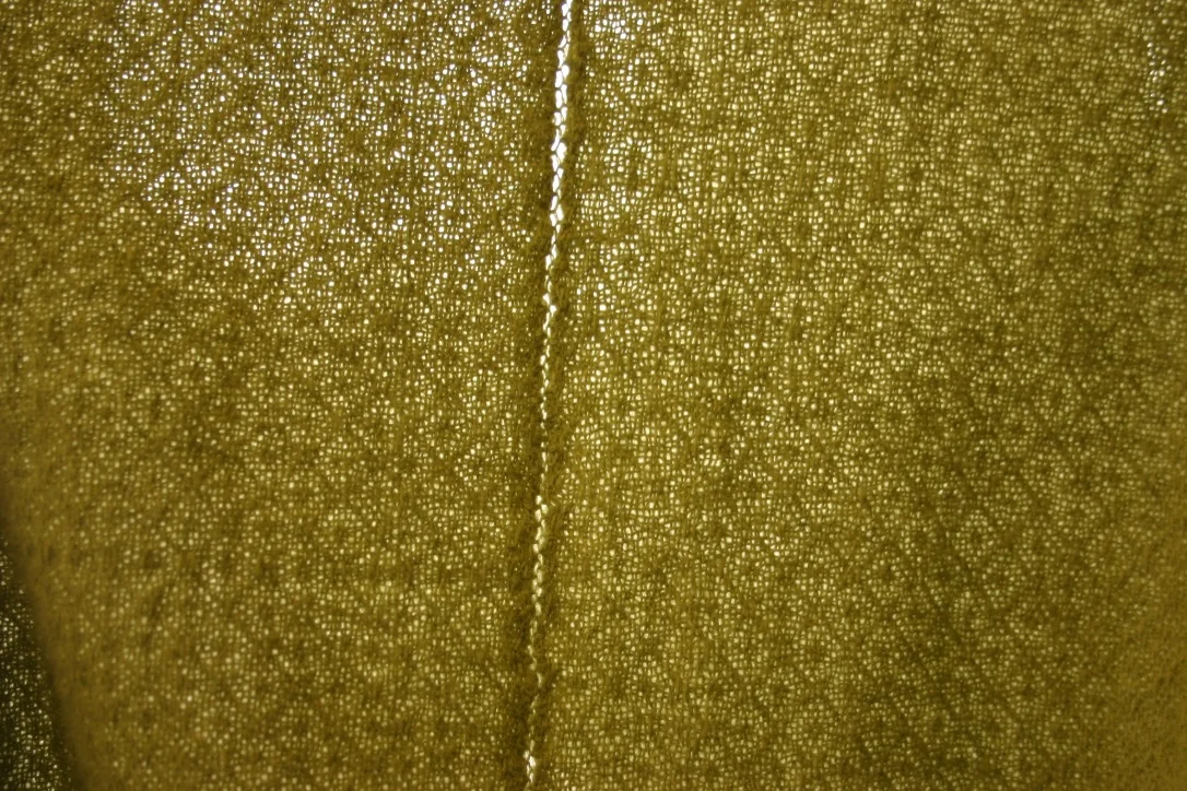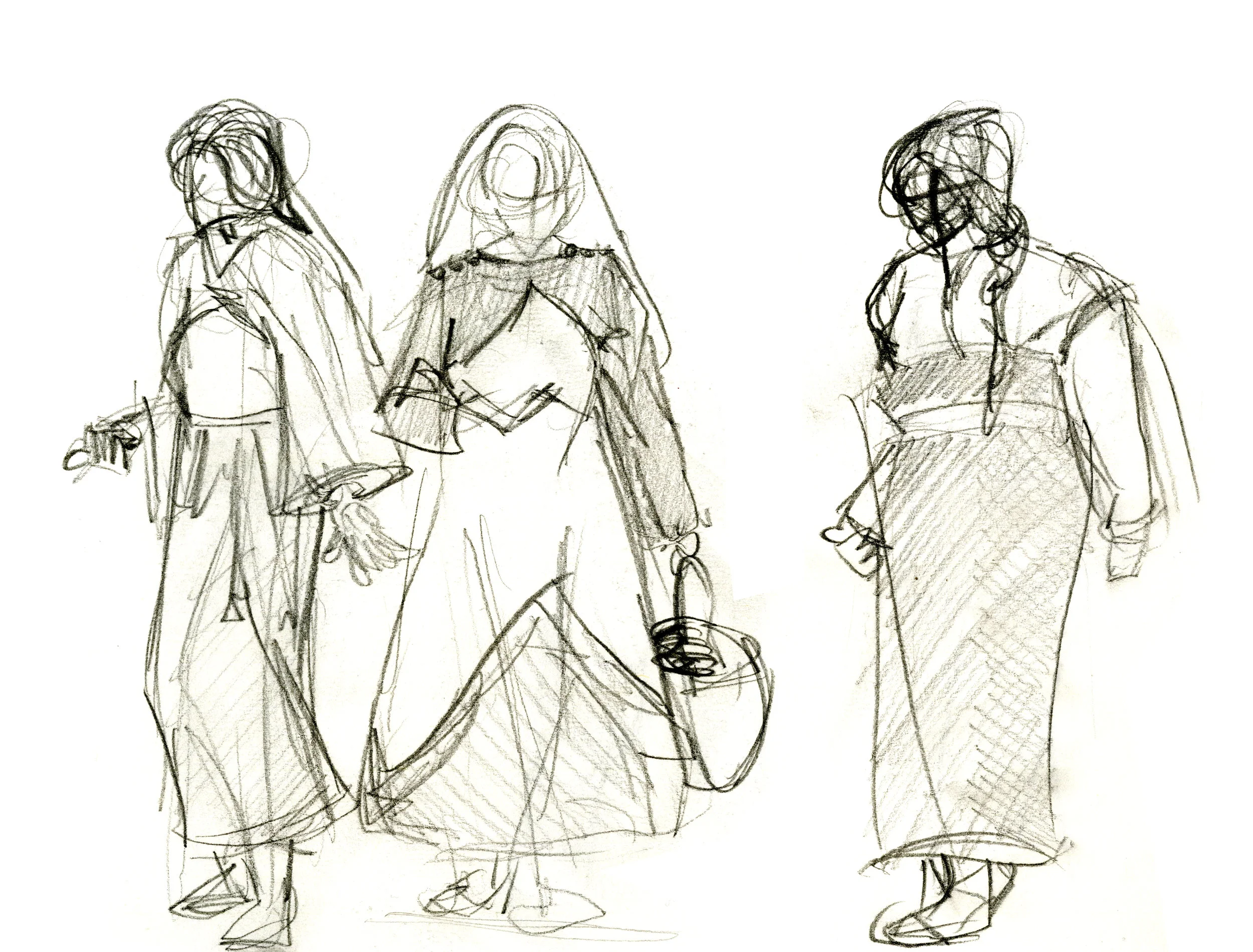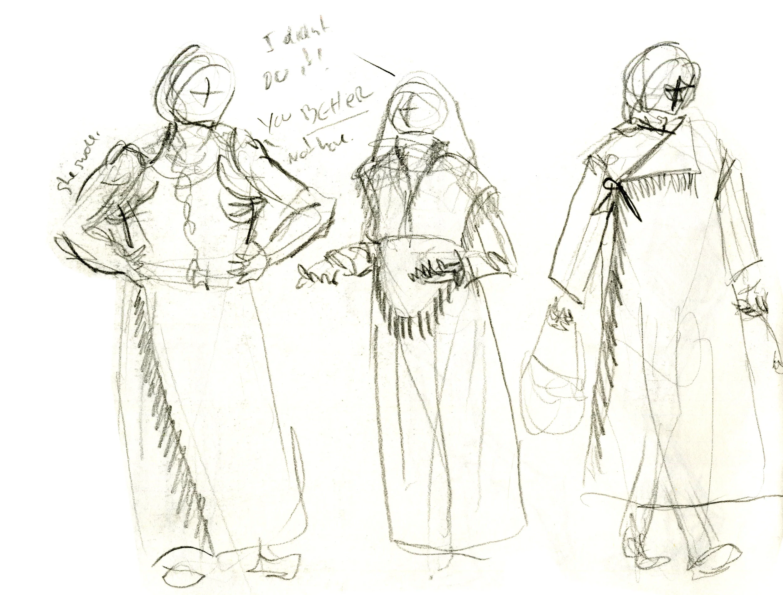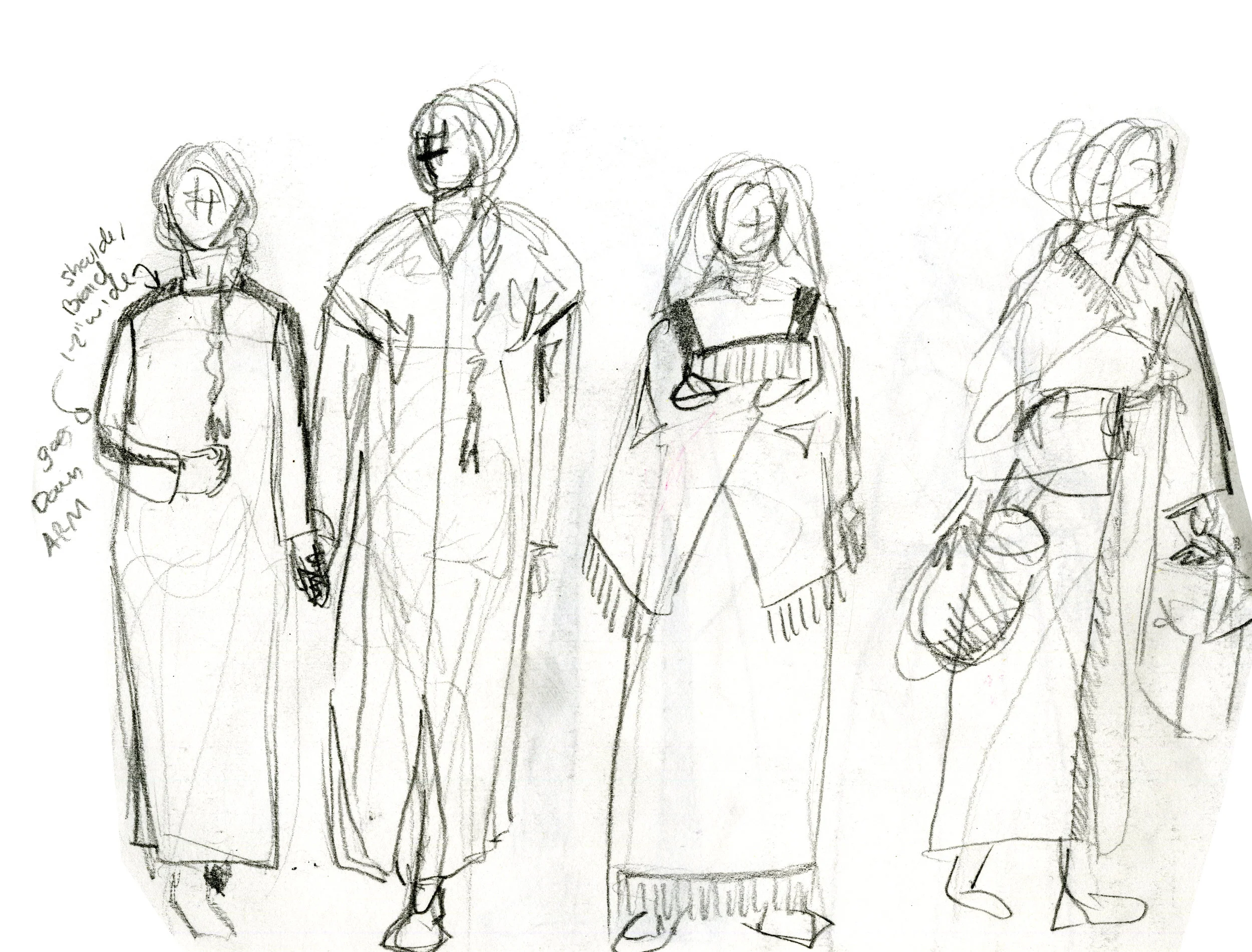 I wanted to express the Wheel’s world through very simple cuts, contrasting with and elaborately woven textiles. I developed a style of pattern cutting which used only square and rectangular shapes of material – intended to be sewn together straight off the loom. I investigated the variety of textures I could create through weaving, developing a variety of samples on an antique Irish 8-shaft loom, and culminating in the weaving of my own material for the final costumes.